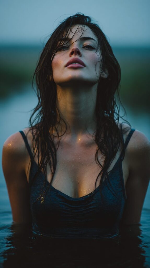woman standing motionless in waist-deep dark water, shoulders slightly drawn inward, fingertips barely breaking the surface as they drift outward with the current, chin tilted as if listening, gaze unfixed just past the camera, a slow breath visible in the rise of her collarbone, long hair clinging in damp strands, soft ripples spreading unevenly around her, overcast dusk light, desaturated blue-gray tones, stillness carrying quiet tension