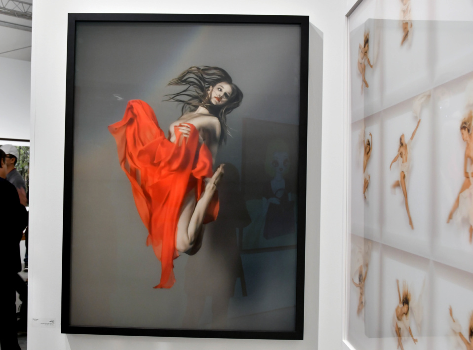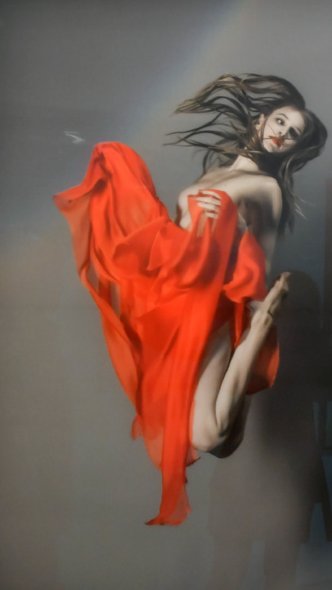 “dark-haired, beautiful Caucasian woman in red cloth flying on the wind, wearing minimal clothing, full-body, full-length, dancing, detailed background, gray color scheme.”