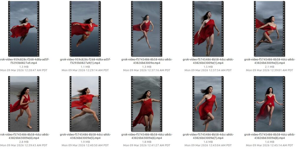 Between 12-second bursts of racing came the 6-second red fabric sequences — a floating woman moving through air, a visual metaphor for freedom and release. These clips were generated using a layered prompt workflow: