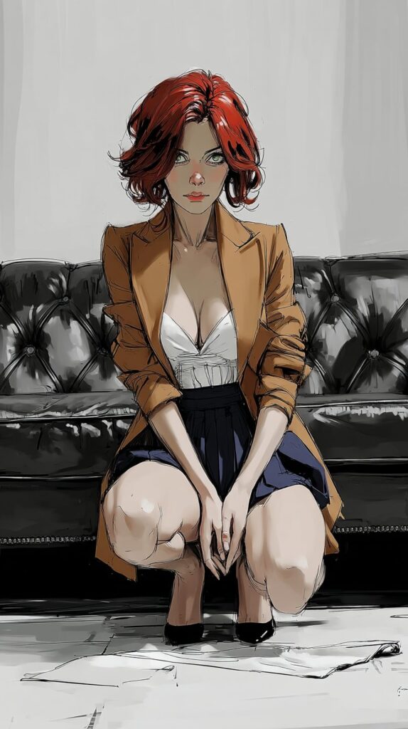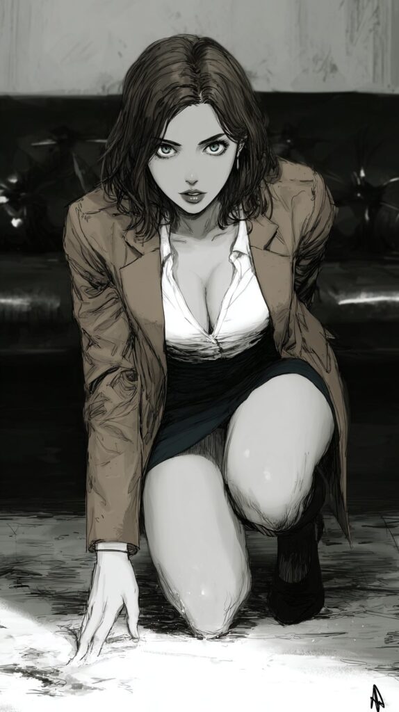 THE SAME PROMPT with different style references: full body shot, beautiful woman kneeling on both knees on the floor beside a luxurious leather couch in a high-end apartment crime scene, one hand lifting the dust ruffle to look underneath the couch, other hand resting on the floor for balance, graceful athletic build, dark red shoulder-length wavy hair, sharp intelligent green eyes, confident focused expression, wearing an open camel-hair blazer in rich warm camel color soft brown with golden-beige undertones, white blouse with modest neckline, navy-blue pleated mid-thigh skirt, black 4-inch stiletto high-heels, professional elegant detective, dramatic cinematic lighting, painterly digital illustration, textured brushwork, glossy skin highlights, stylized proportions –no photorealistic, photo, realistic skin pores, blurry face, long hair covering face, cleavage, deep neckline