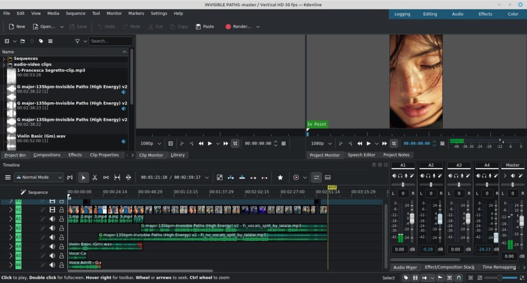The music soundtrack track was trimmed slightly. Three free key-of-G tonal pads from Multiply Sound transitioned the introduction to land precisely under the visual timeline.